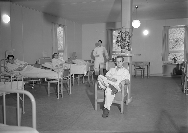 Sjukhussal på sjukhuset på F 3 Malmen, 1942. Interiör och patienter.