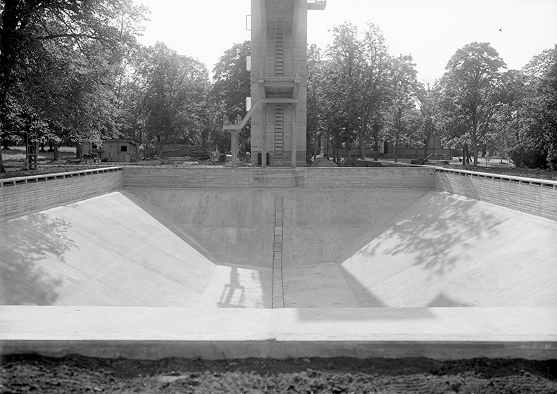 Simbassäng på F 3 Malmen, 1943. Bassäng utan vatten, pågående markarbete.
