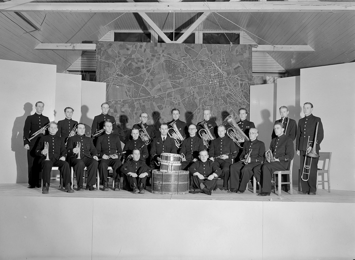 Musikkåren på F 3 Östgöta flygflottilj, 1942. Grupporträtt på scen.