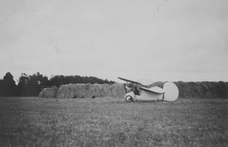 Flygplan Flygande Loppan på ett flygfält. Sidovy.