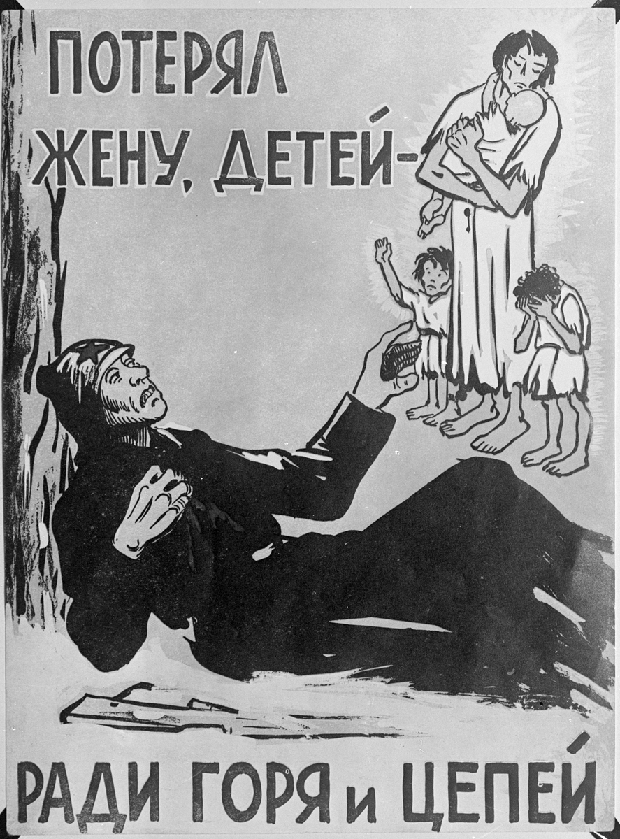 Reproduktion av flygblad: propaganda, från finska sidan till Röda Armé-soldater under finska vinterkriget 1939-1940. Tecknat motiv med text på ryska.