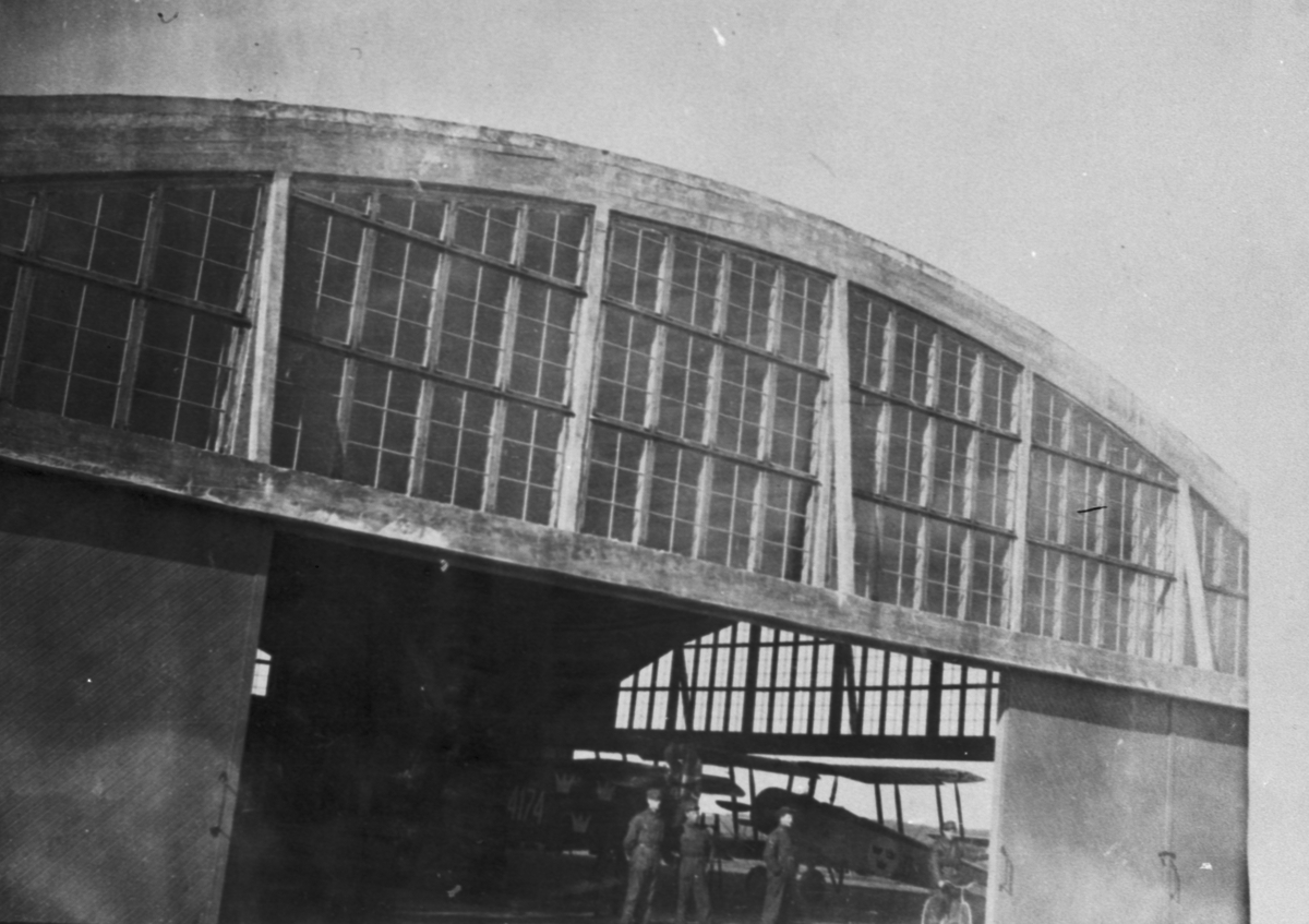 Flygplanhangar med personal från Flygkompaniet samt flygplan Phönix C.I nummer 4174 samt FVM Tummeliten. Vy utifrån.