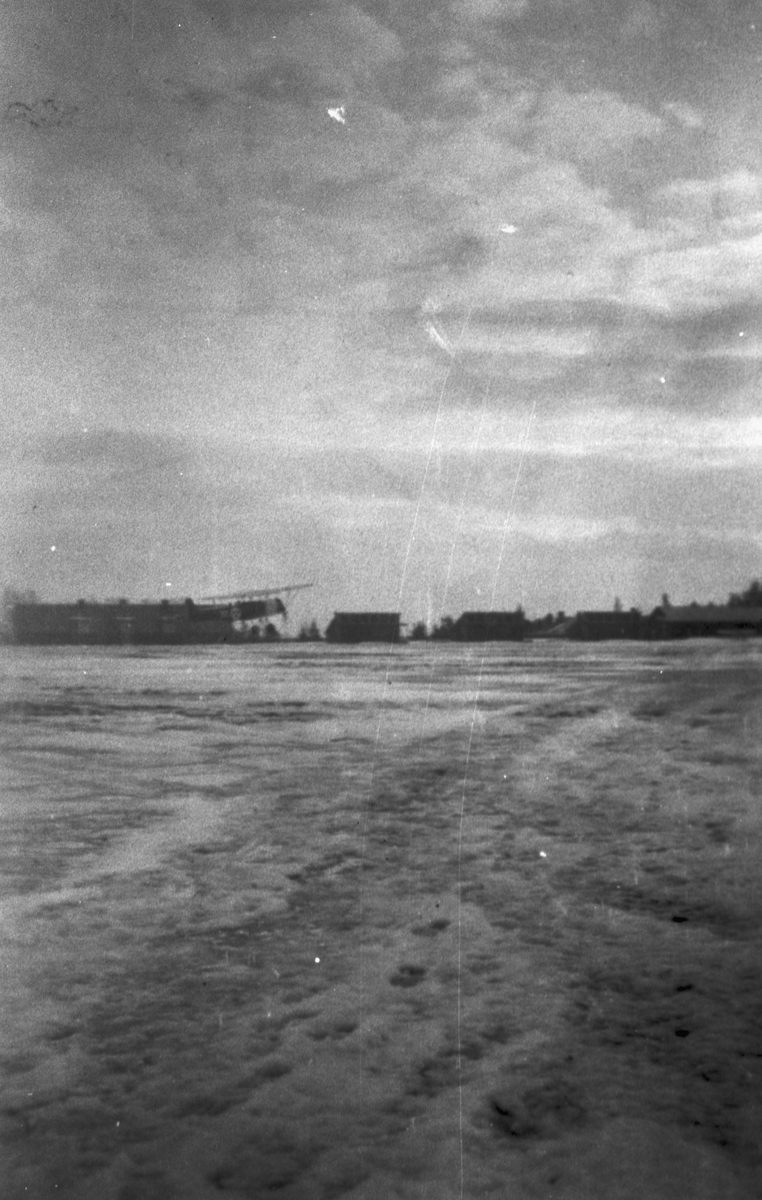 Ett militärt flygplan startar eller landar på ett flygfält, vintertid. I bakgrunden syns byggnader eller hangarer. Suddig bild.