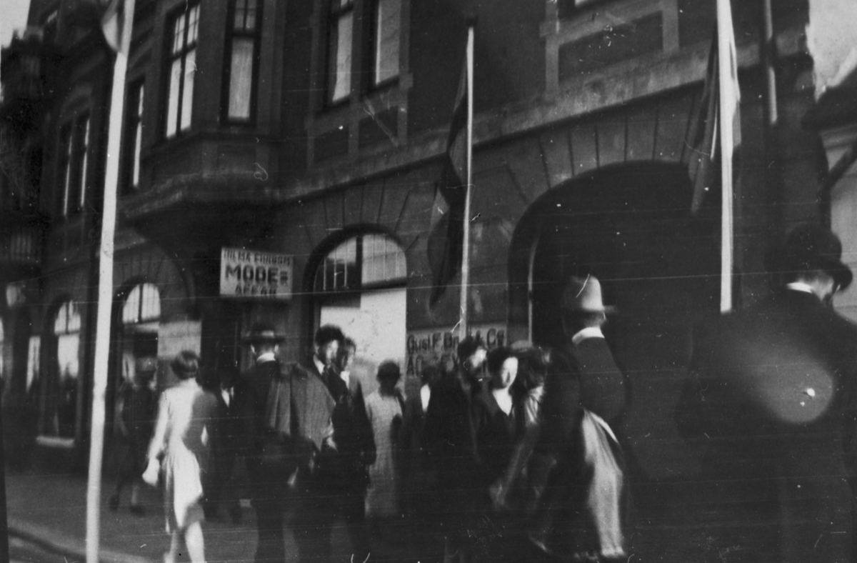 Gatubild. Människor går på en trottoar i okänd ort. En butiskskylt anger Hilma Ehnbom modeaffär. Suddig bild.