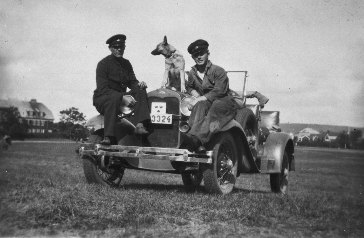 Två flygsoldater och en hund sitter på en militärregistrerad bil.