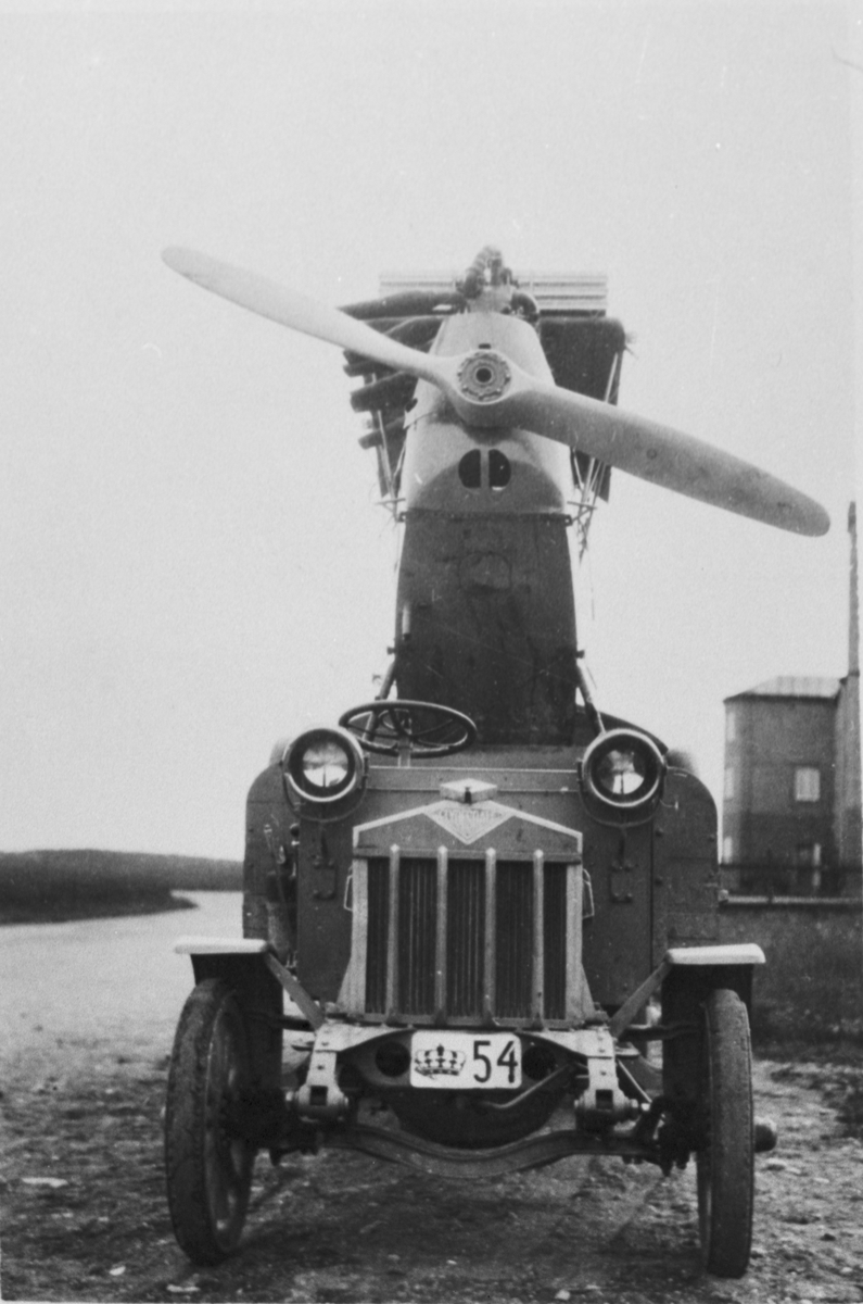 Kropp till flygplan Phönix C.1 Dront lastad på en lastbil. Vy framifrån.
