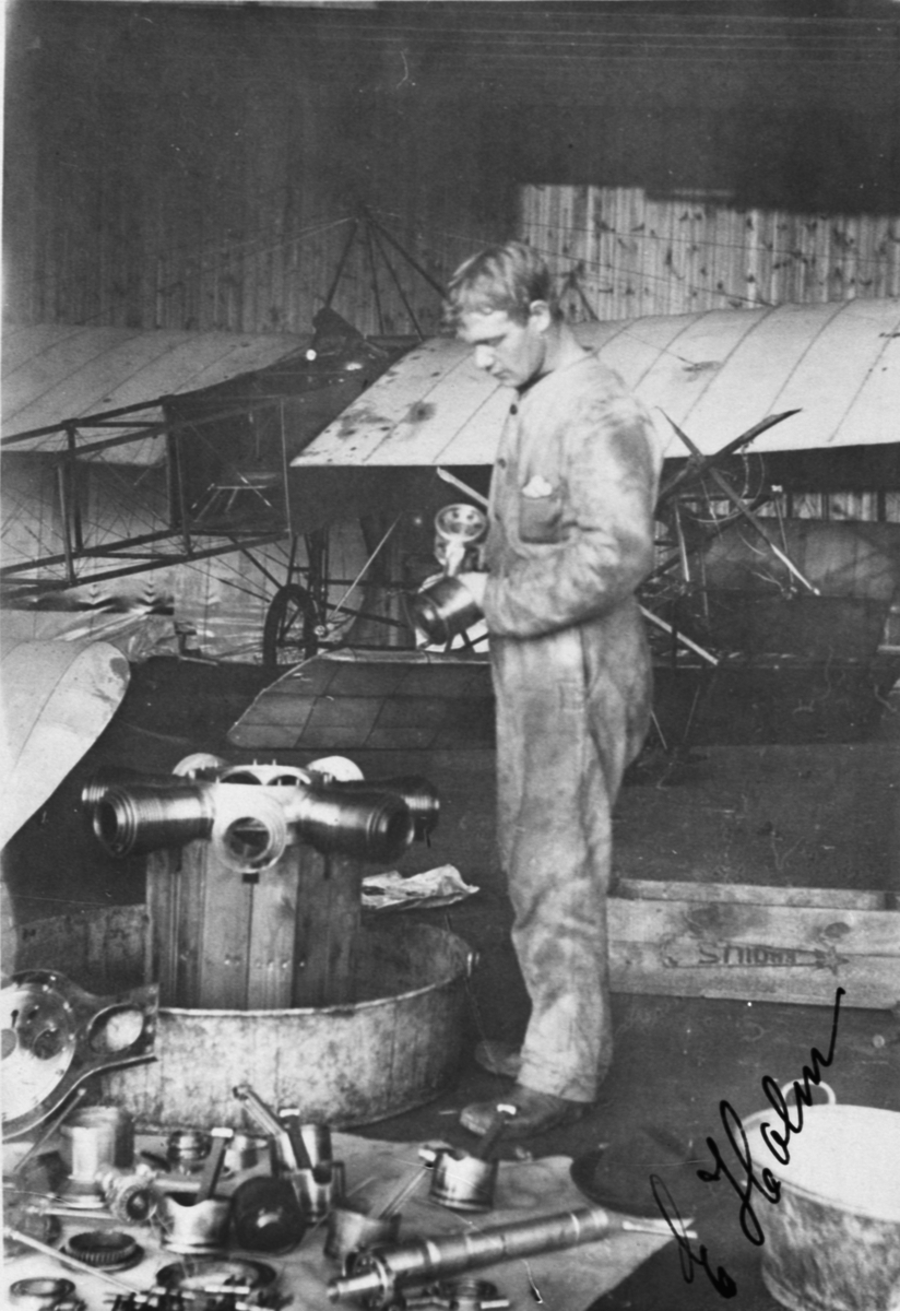 En flygmekaniker monterar flygplansmotor Gnome. I bakgrunden står ett flygplan av typ Thulin A. Cirka 1914-1916.