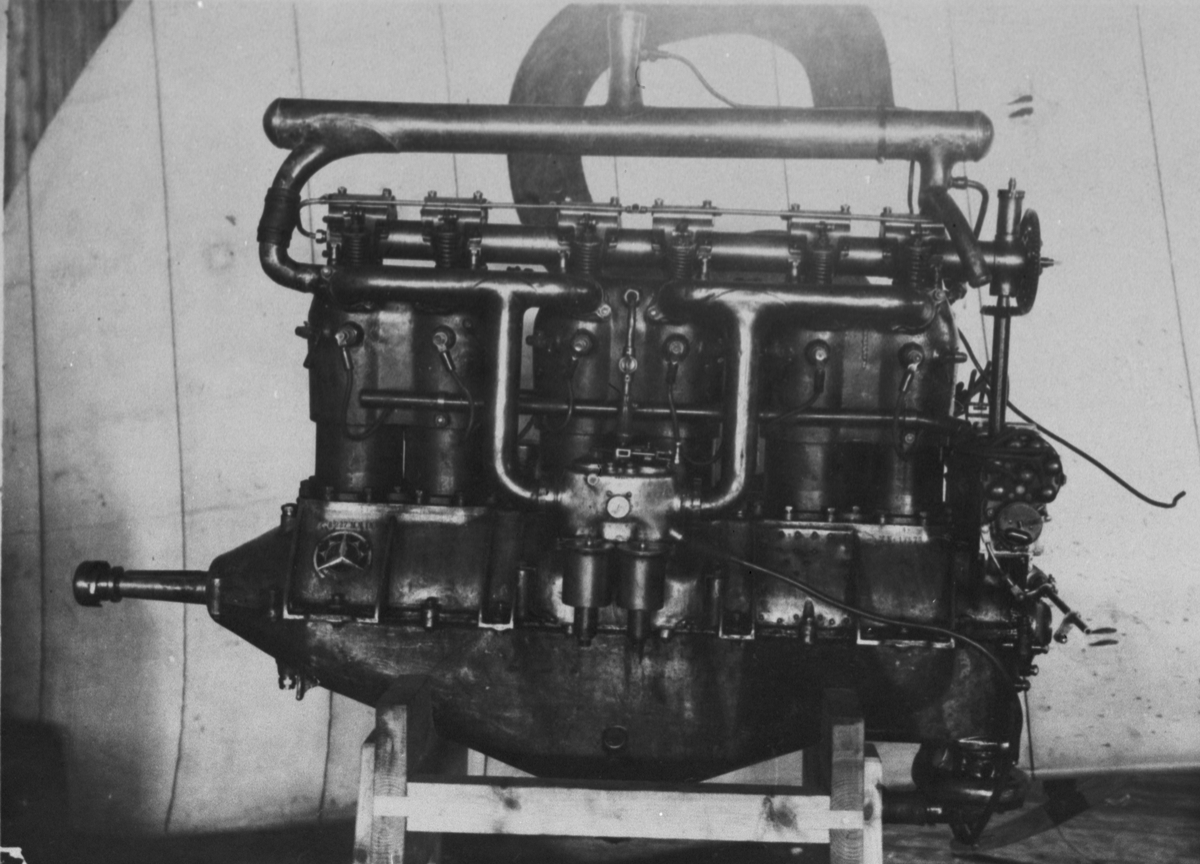 Närbild av flygmotor Mercedes, 120 Hk, uppställt i Ljungbyhed, 1918.