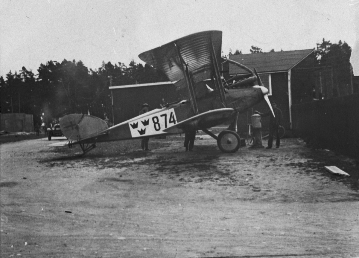 Flygplan Thulin FA märkt nr 874 uppställd vid byggnad. Mekaniker vid flygplanet.