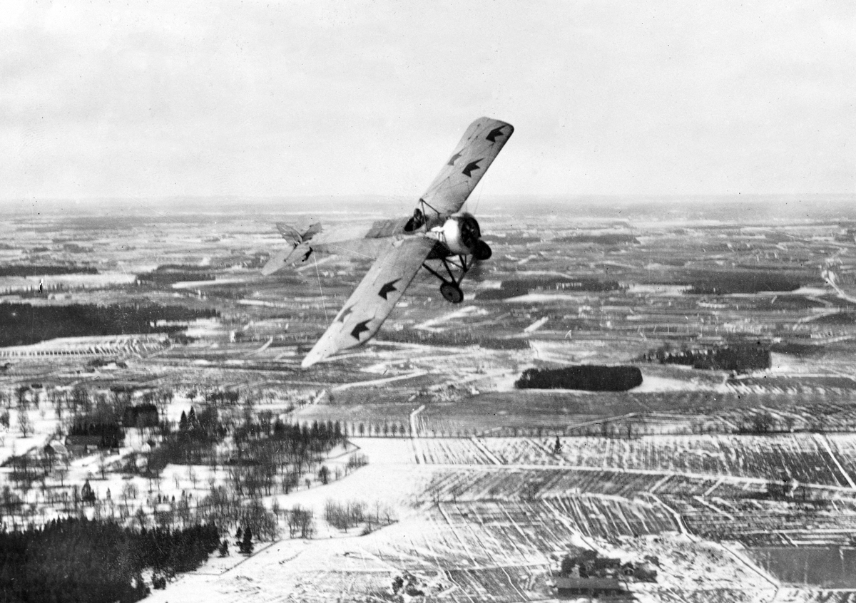 Flygplan Thulin K i luften över Linköping, vintertid, 1917.