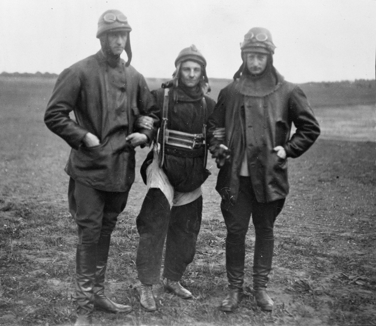 Fallskärmshoppare (i mitten) samt två militära flygare står på ett fält, 1919.