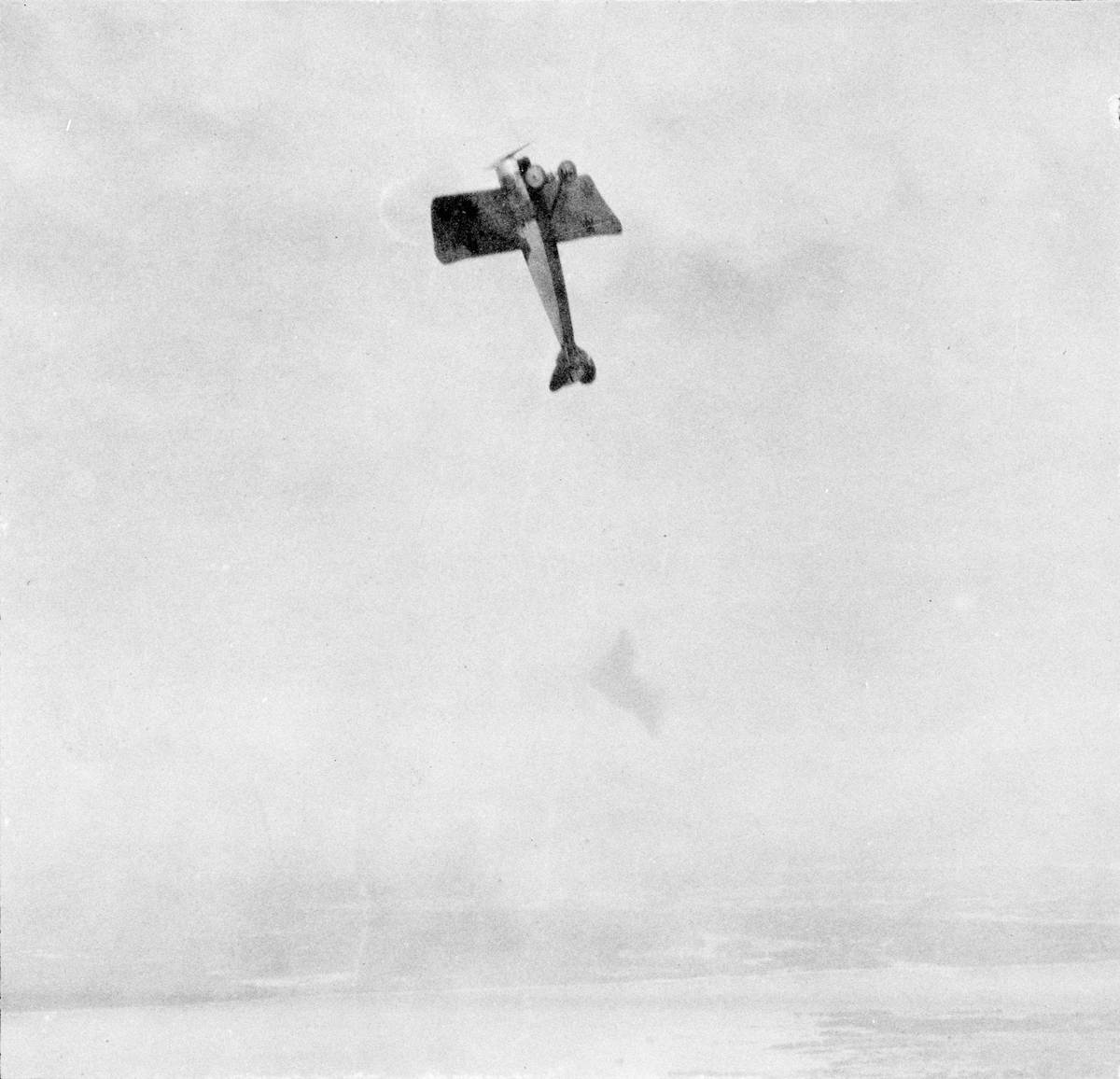 Flygbild av flygplan Thulin K i luften, under en looping, omkring 1918-1919.