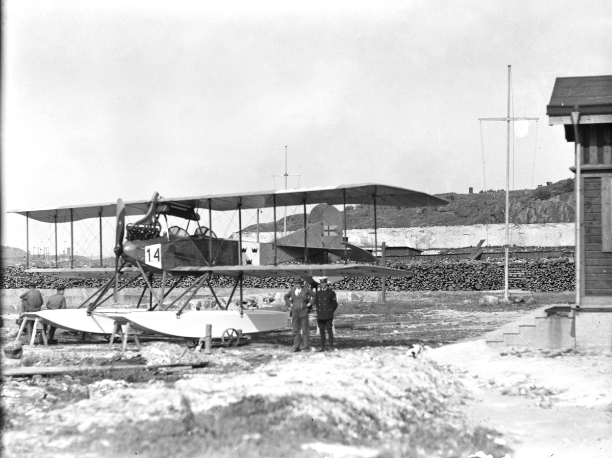 Flygplan Thulin G märkt nr 14 står vid en flygstation, omkring 1918-1919.