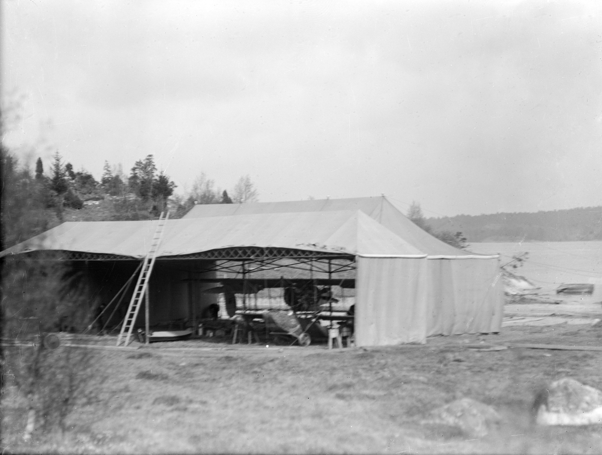 Sjöflygplan i tälthangar vid strand, 1910-talet.