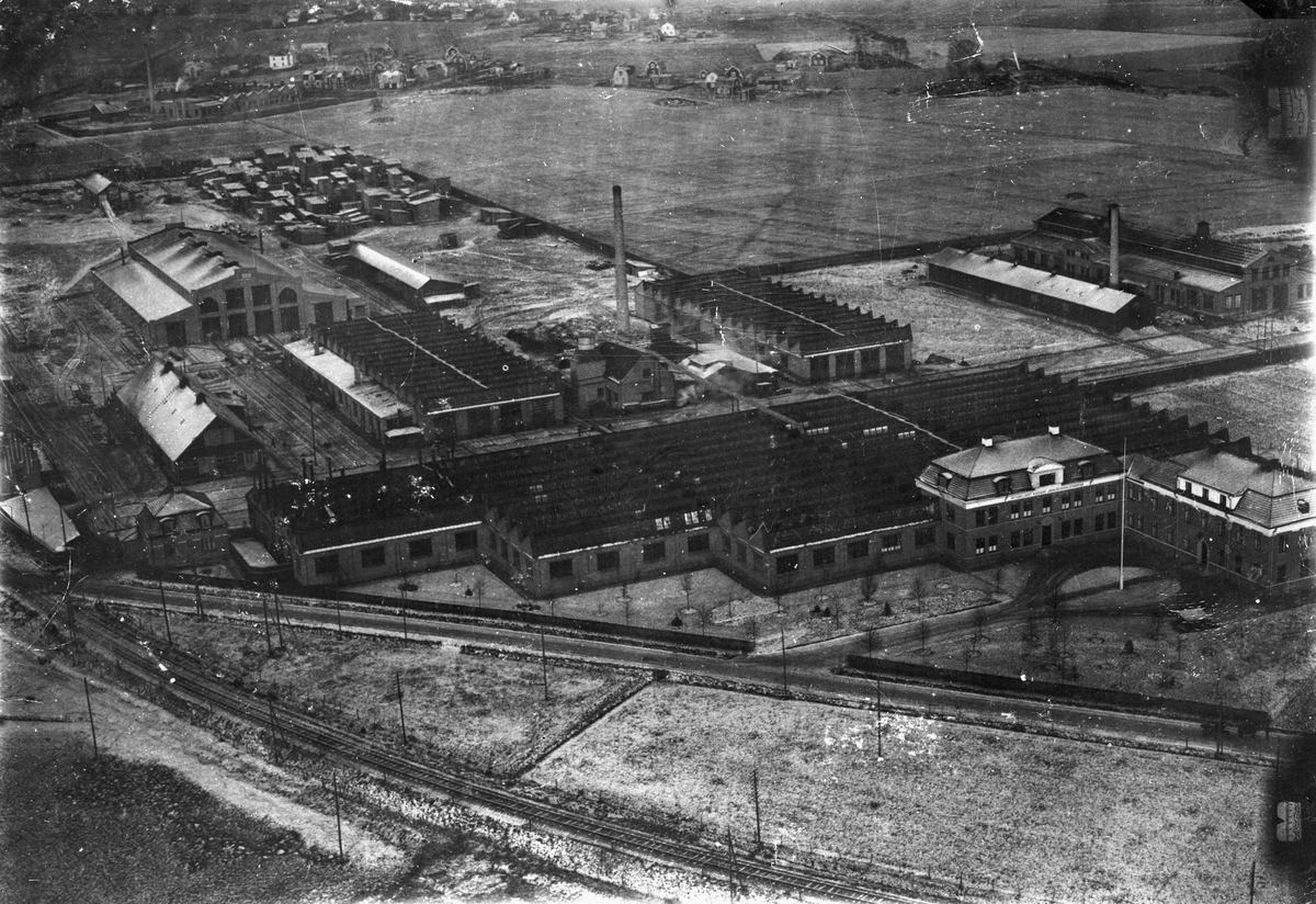 Flygfotografi av ASJ fabriksområde i Tannefors, från söder. Omkring 1930.
