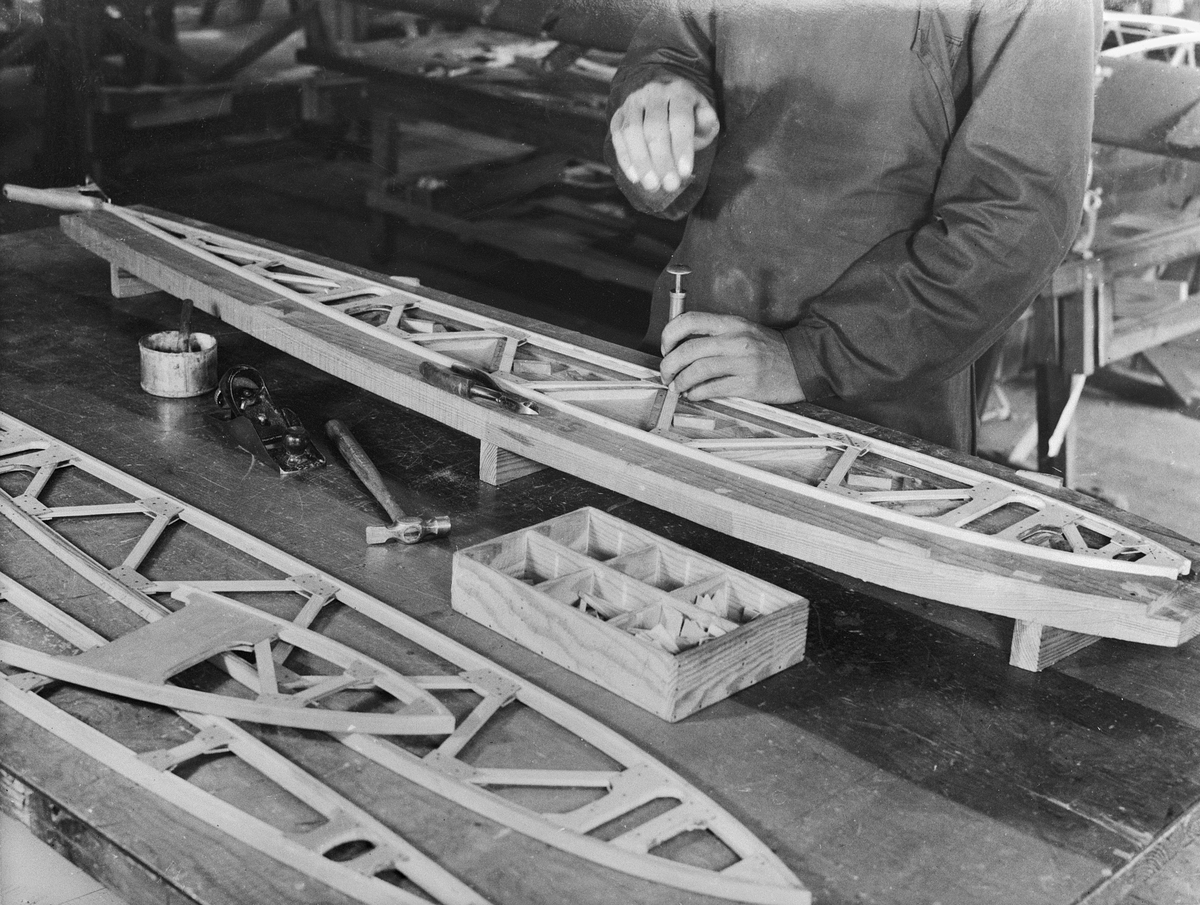 Tillverkning av fackverksspryglar till flygplansvinge på Centrala flygverkstaden Malmslätt, tidigt 1930-tal.