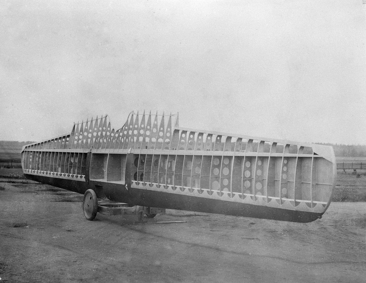 En oklädd vinge till flygplan Fokker står uppställd på transportvagn utomhus vid Centrala flygvekstaden Malmslätt, tidigt 1930-tal.