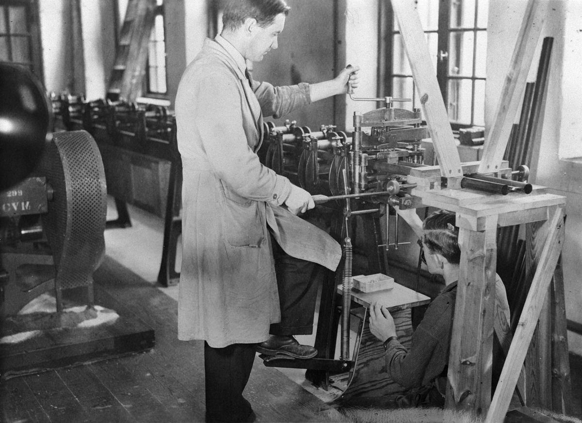 Arbete med vingbalk till flygplan på Centrala verkstaden Malmslätt, 1930-tal. Två män i arbete.