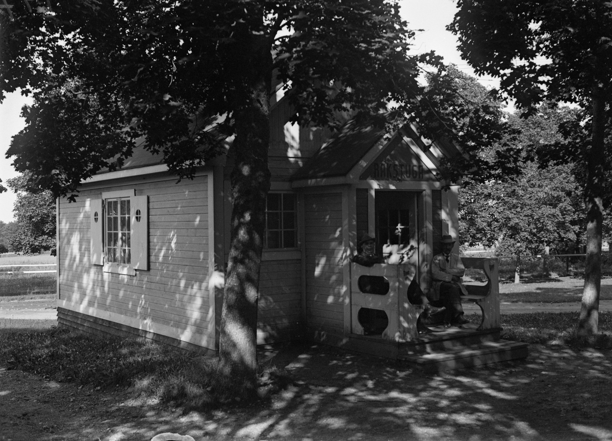 Två män sitter utanför rakstuga i Malmslätt, omkring 1921-1924.