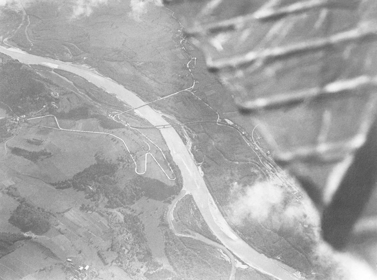 Flygbild av en flod i Europa, 1910-tal. Med del av flygplansvinge i förgrunden.