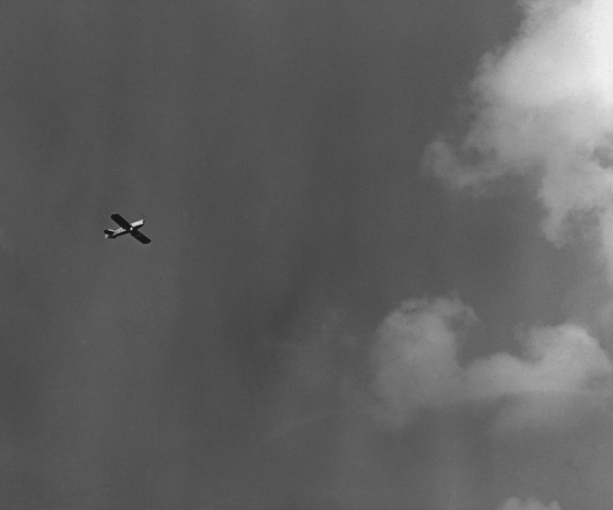 Flygplan Sparmann S-1a, registrering SE-ADX, i luften efter start. Vy nerifrån.
