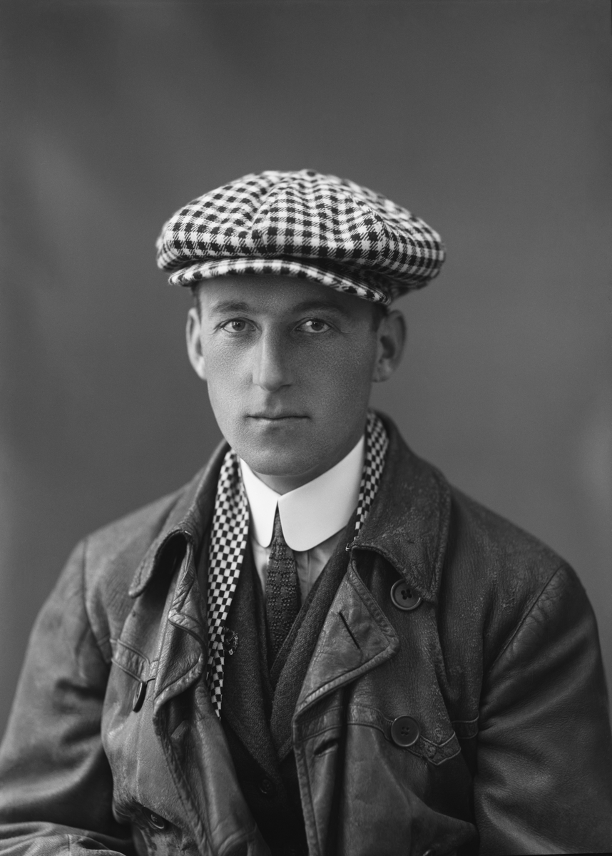 Porträttfoto av Edmund Sparmann i kostym, halsduk, keps och flygarjacka i studiomiljö, omkring 1914-1918.