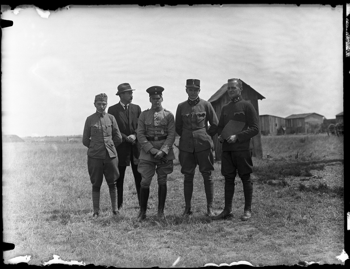 Gruppbild. Fyra soldater och en civilklädd man från Österrike-Ungern står på ett fält. Byggnader i bakgrunden.
