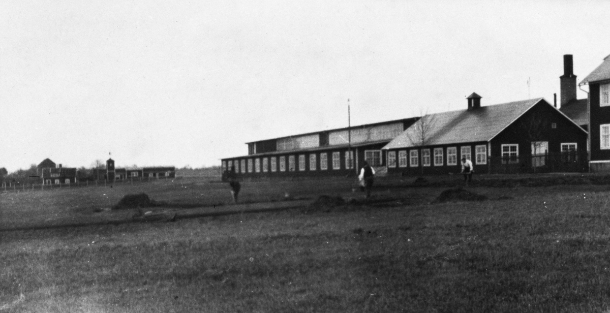 Monteringshall och matsal vid Flygkompaniets verkstäder på Malmen, omkring 1920-1924. Längst till höger syns arbetarbaracken kallad Mahognyvillan. Vy från sydväst.