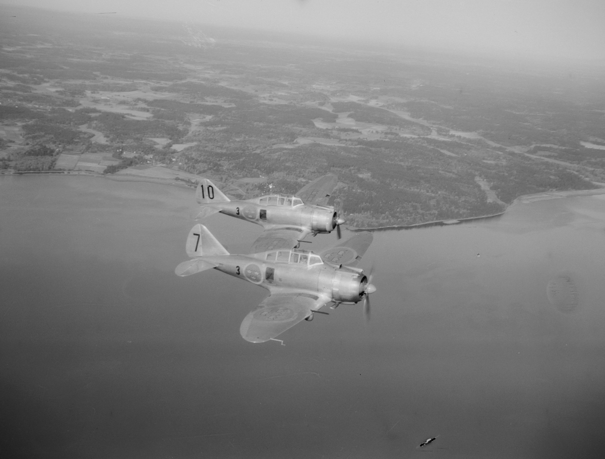 Två flygplan J 9 S från F 3 Malmen flyger i rote över sjön Roxen.