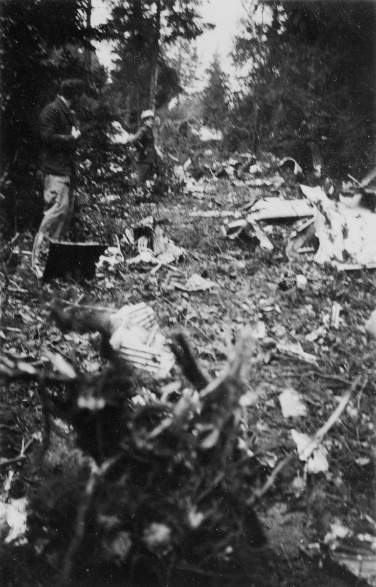 Haveridelar från flygplan B 3 Junkers Ju 86K i skogsparti. Flygplanet har slagits i småbitar och skapat en korridor mellan träden. Två personer står bredvid vrakresterna.