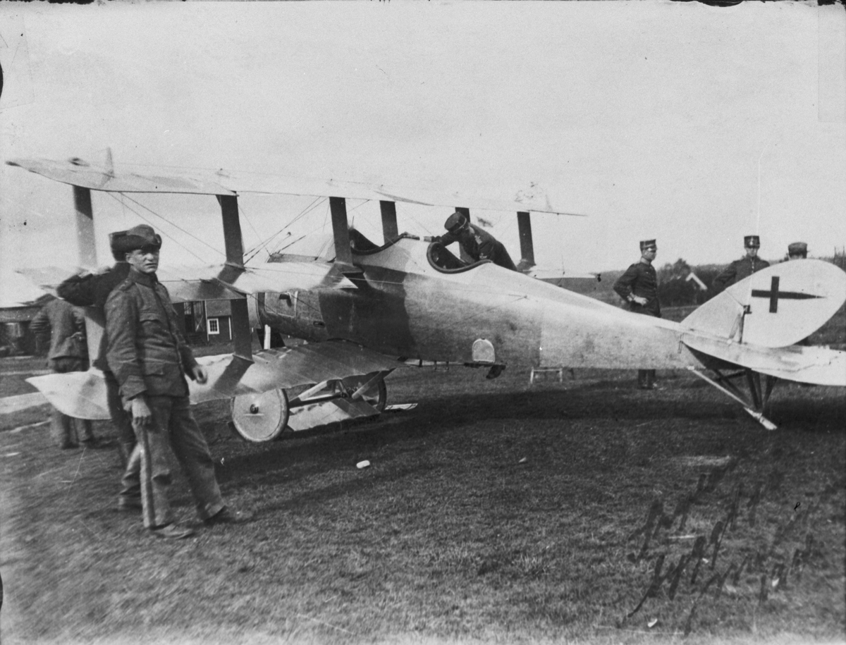 Flygplan FVM Triplanet på ett flygfält på Malmen. Militärer runt flygplanet.