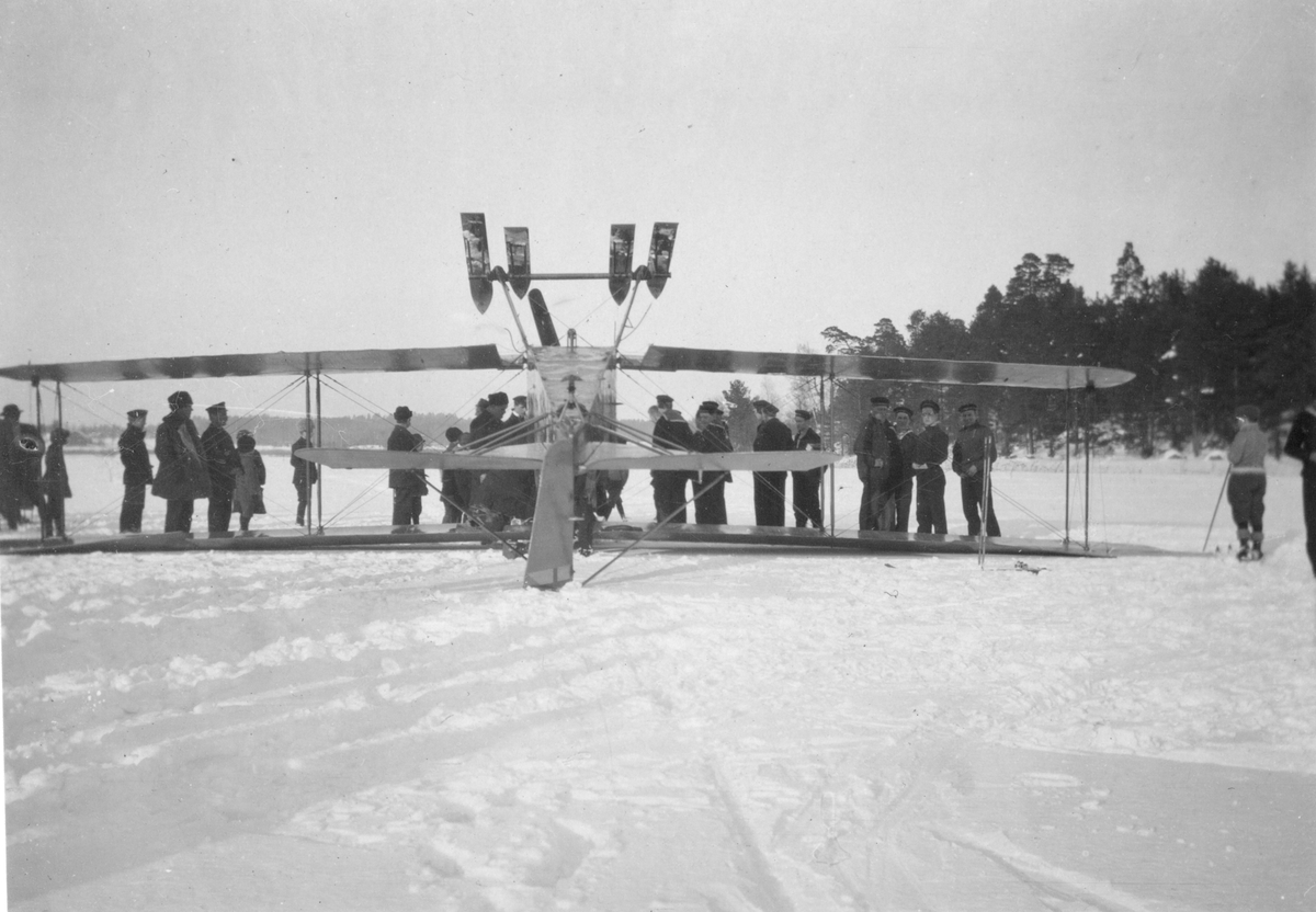 Ett havererat militärt propellerflygplan med skidor ligger upp och ned på isen. I bakgrunden står män ur flottan.