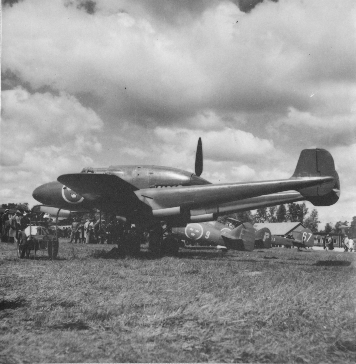 Militära flygplan på ett flygfält. I bakgrunden en folksamling. Närmast flygplan J 21A. Vy från sidan.
