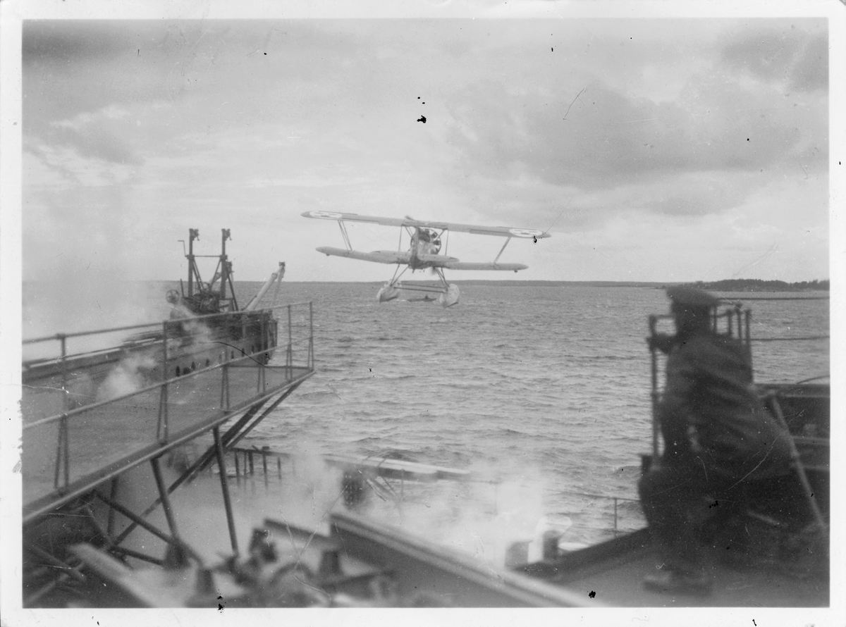 Spaningsflygplan S 9 startar från katapulten på flygplanskryssaren Gotland.