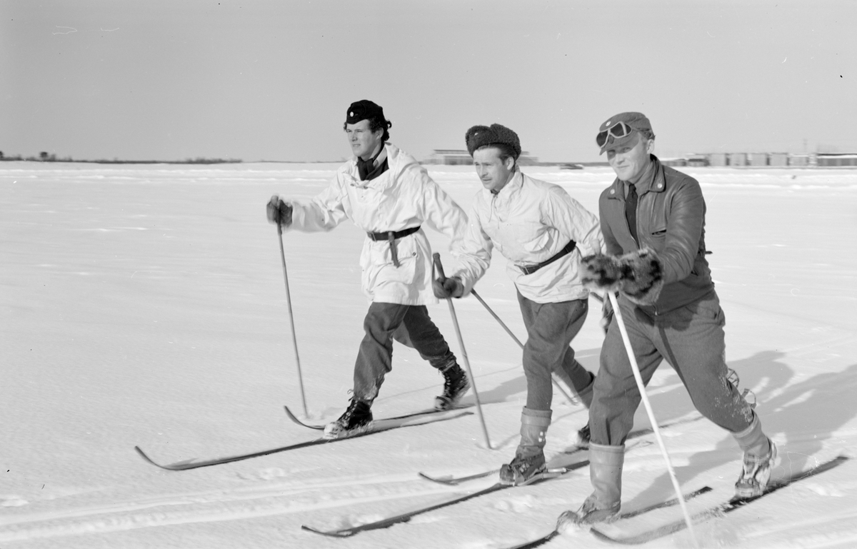 Tre män tillhörande Svenska frivilligkåren i Finland, F 19, åker skidor.