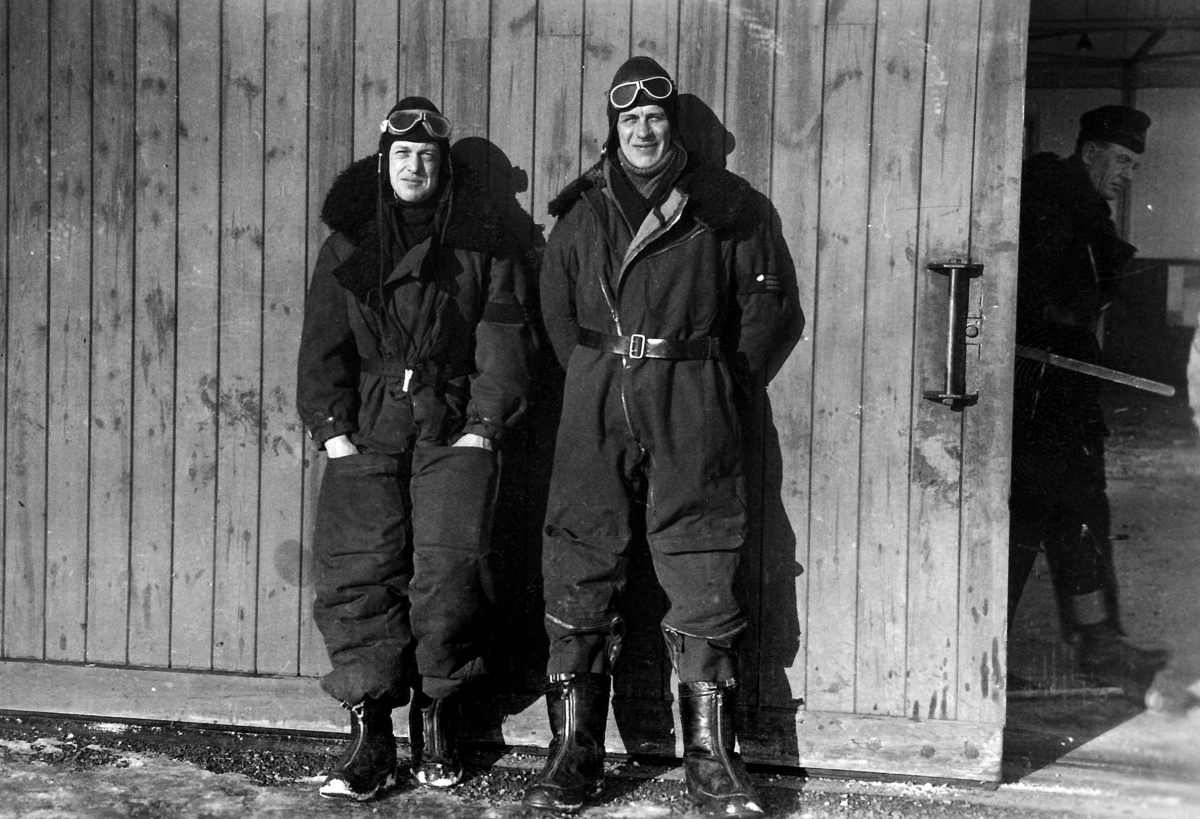 Grupporträtt av två militärflygare i flygoverall ståendes framför en hangarport, vintertid. I bakgrunden syns en annan man inne i hangaren. 1930-tal.