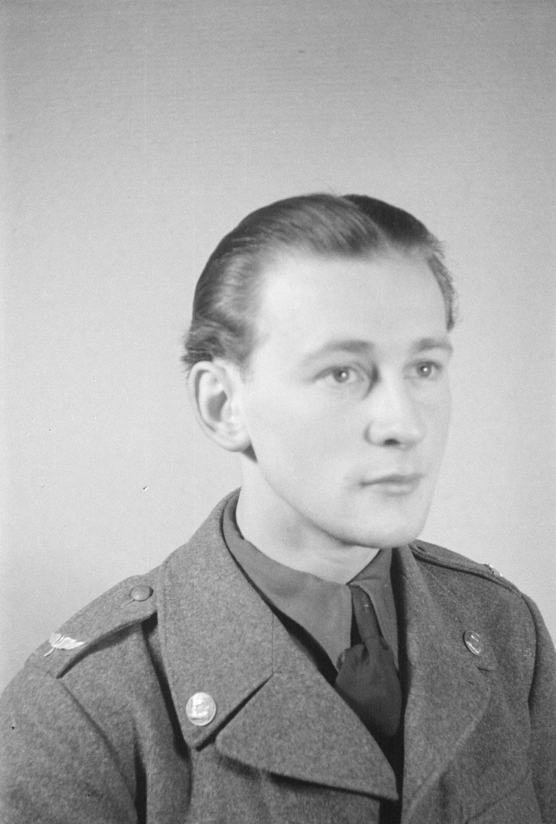 Porträttfoto av soldat Sven Harry Westerberg (nummer 853), mekaniker i Posio vid F 19, Svenska frivilligkåren i Finland under finska vinterkriget, 1940.