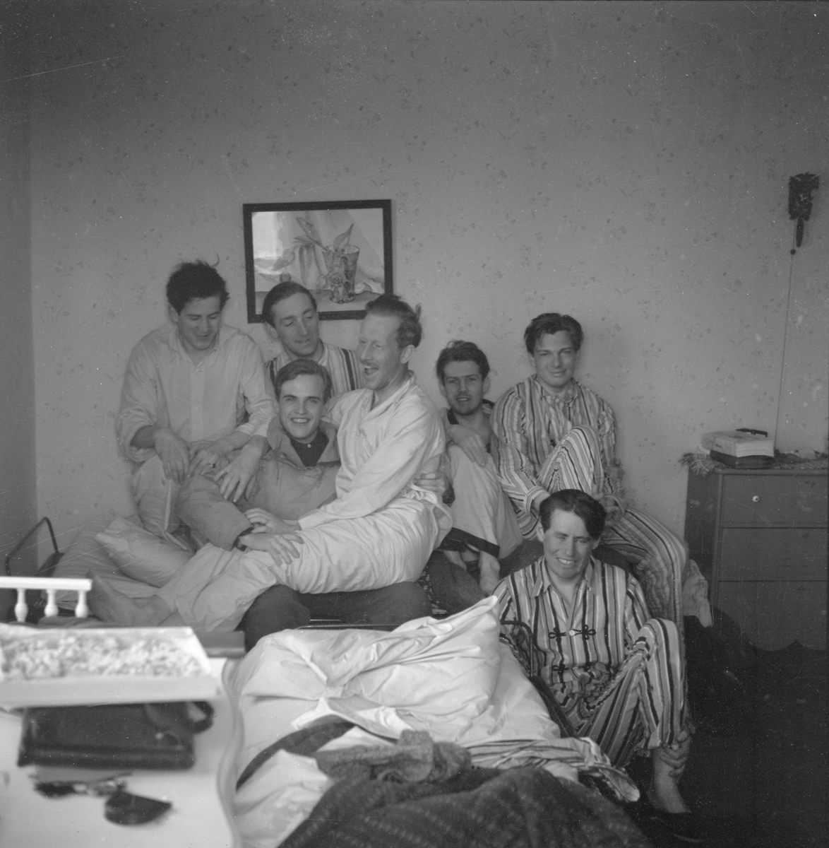 Militärer på förläggning vid Svenska frivilligkåren i Finland, F 19. Iklädda pyjamas vid en säng.