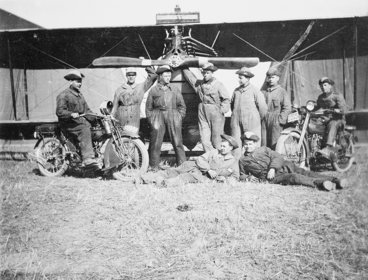 Gruppfoto av manskap vid Flygkompaniet på Malmen omkring 1920. 9 män framför flygplan Albatros, varav två sittandes på motorcykel.