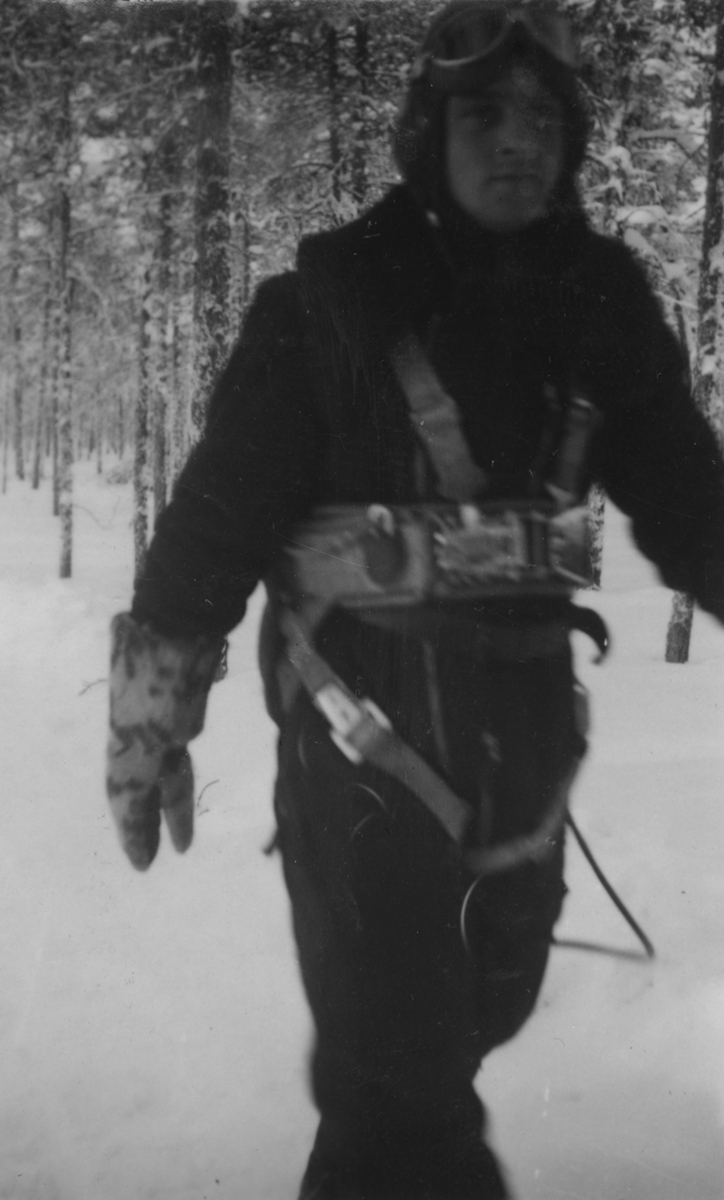 Flygförare Kurt Edenholm i flygarklädsel, gåendes, vintertid, cirka 1941-1944.