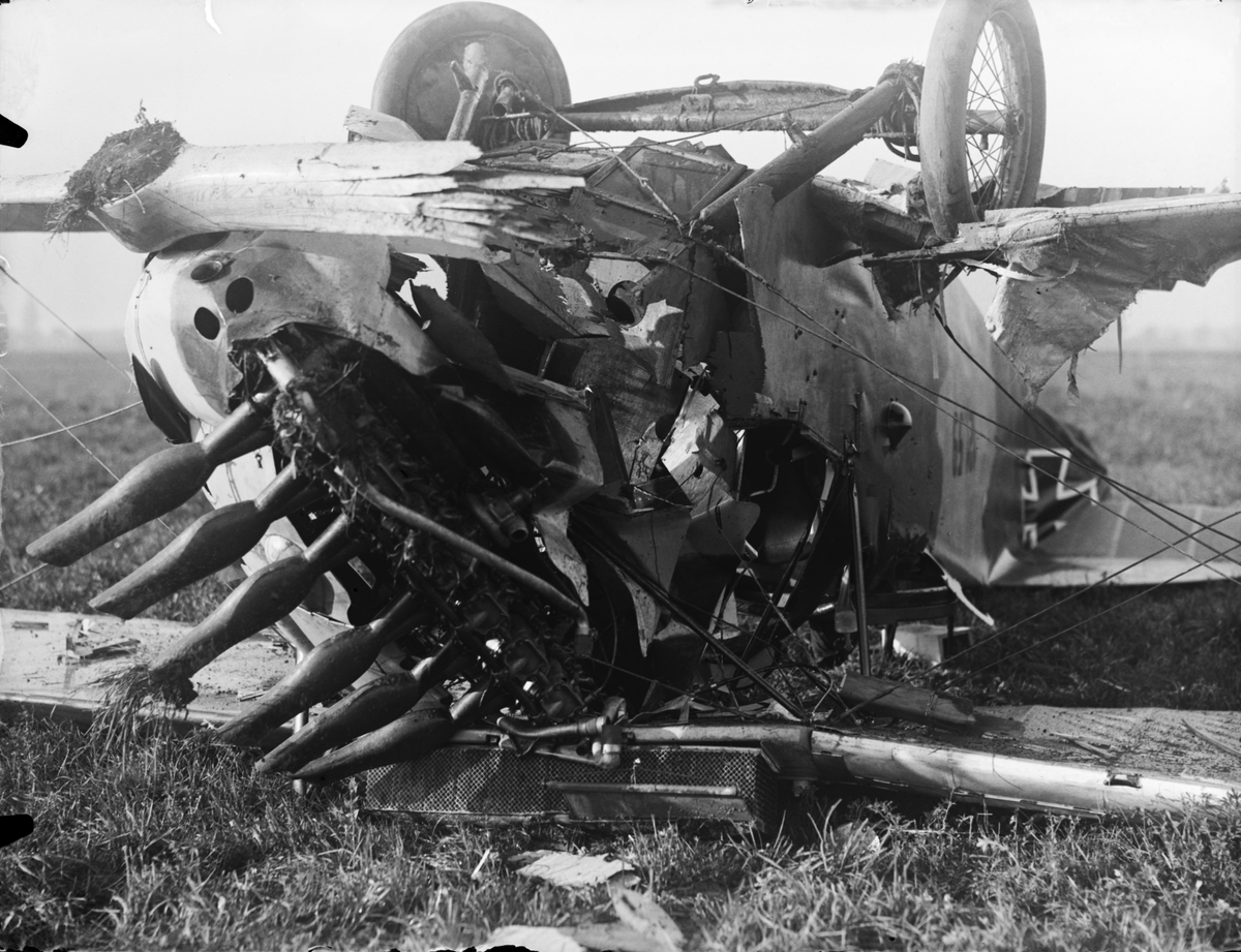 Havererat militärt flygplan Phönix C.I märkt 121.59 tillhörande Österrike-Ungern ligger upp-och-ned på ett flygfält. Närbild från sidan.