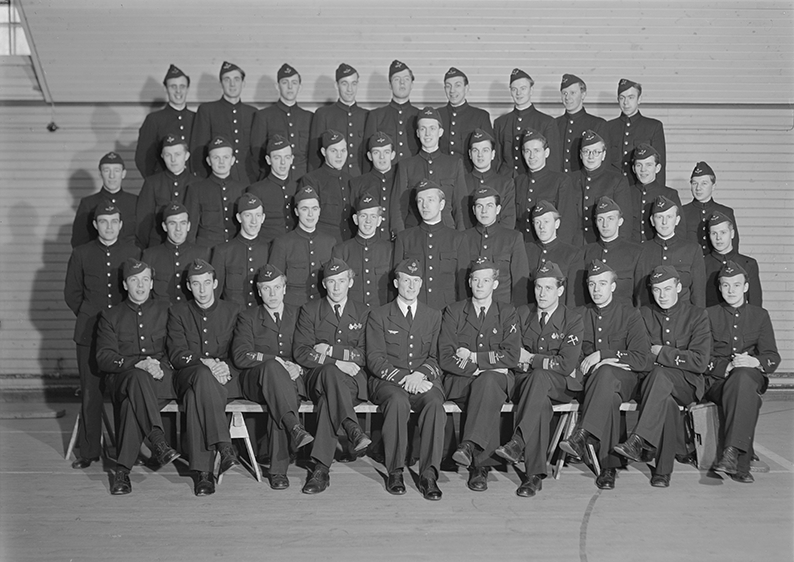 Elever vid 1946 års klass, 2:a plutonen, på F 3 Östgöta flygflottilj. Grupporträtt inomhus.