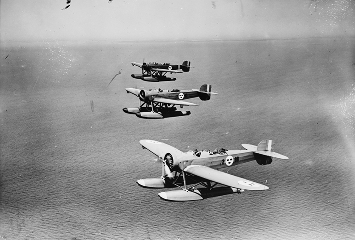Tre spaningsflygplan S 5 från F 2 i luften över vatten.