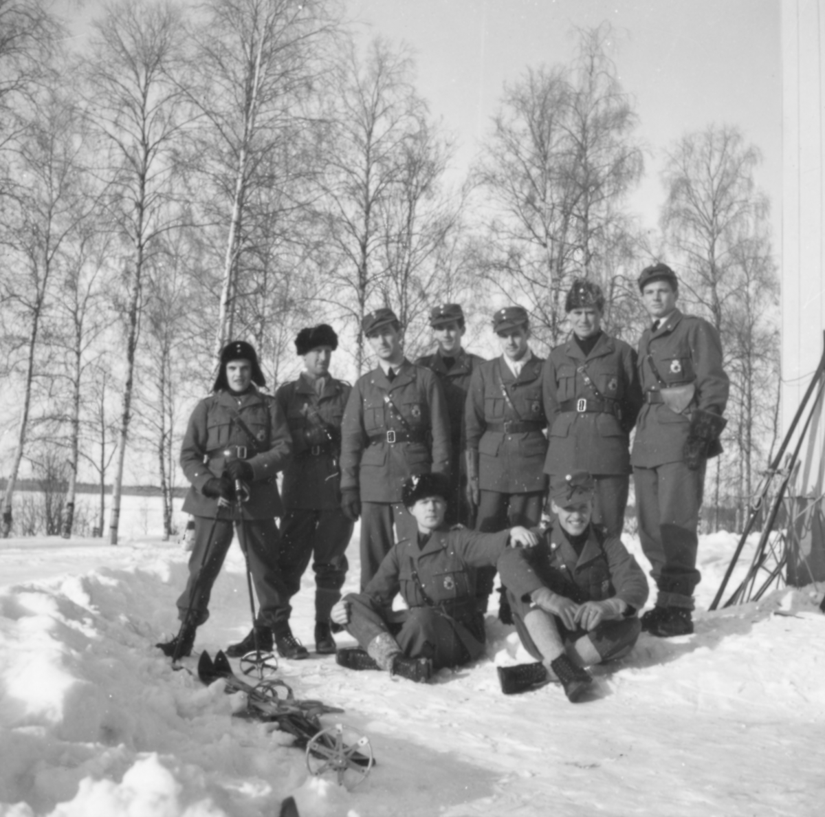 Grupporträtt. Jaktflygförare vid Svenska frivilligkåren i Finland, F 19, utomhus.