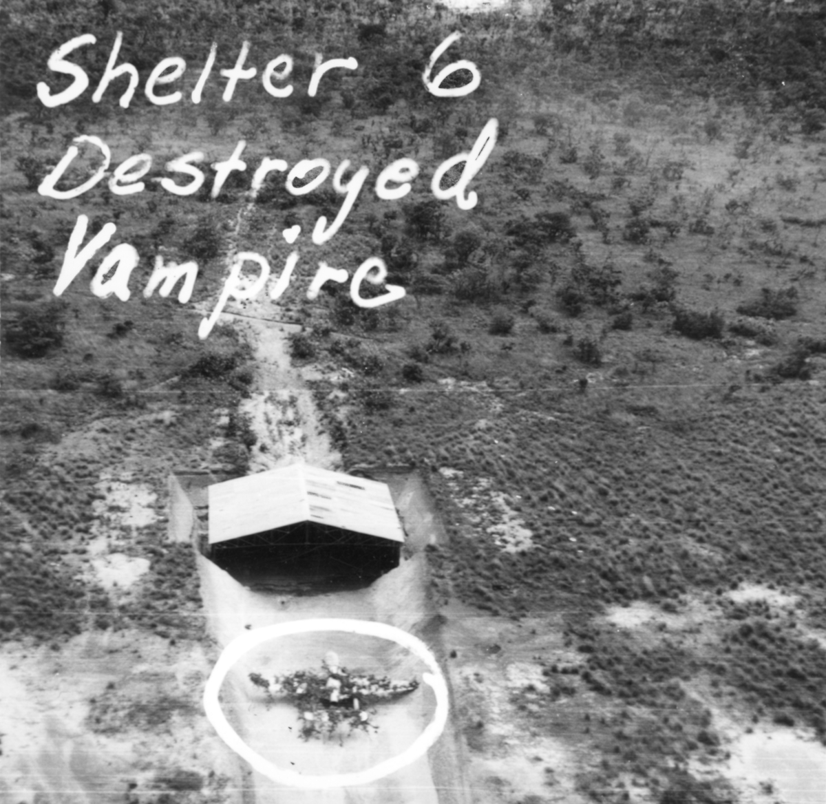 Flygspaningsbild av attackerat flygplanvärn vid kantangesiskt flygbas. I mitten står ett kamouflerat flygplan De Havilland Vampire. Foto taget efter anfall av F 22 under Kongokrisen, den 29 december 1962. Med påritad spaningsinformation "Shelter 6 Destroyed Vampire".