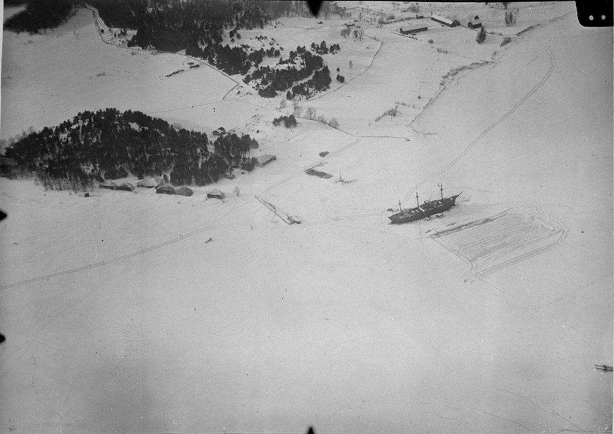 Flygfotografi över Hägernäs flygstation, vintertid. Logementsfartyg till höger.