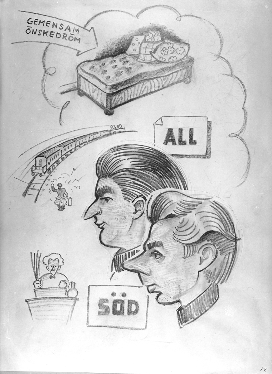 Karikatyrbild av militärer ur flygvapnet, 1930-tal. Märkt 'ALL', "SÖD'. Avfotograferad teckning.