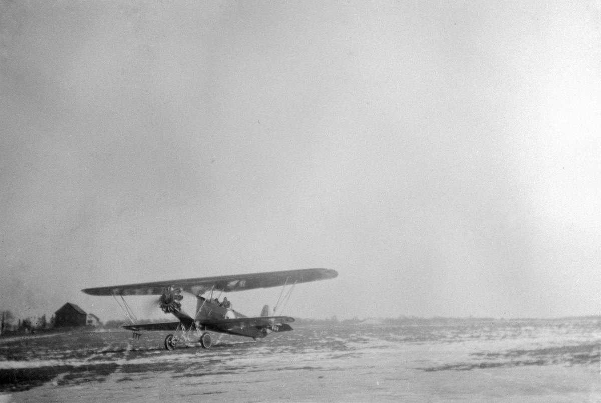 Flygplan Fokker S 6, C.V. uppställd framför CVM hangarer på Malmen, vintertid, omkring 1930. Röda och Gula förråden i bakgrunden.