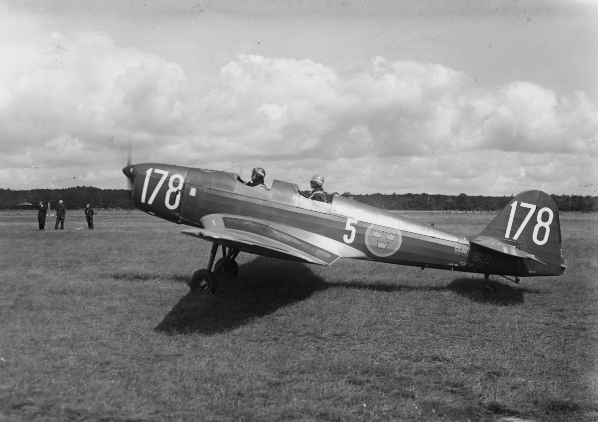 Flygplan SK 15 märkt nummer 178 tillhörande Krigsflygskolan F 5 med flygförare och flygelev på ett flygfält. Sett snett bakifrån. I bakgrunden syns ett flertal flygplan SK 15