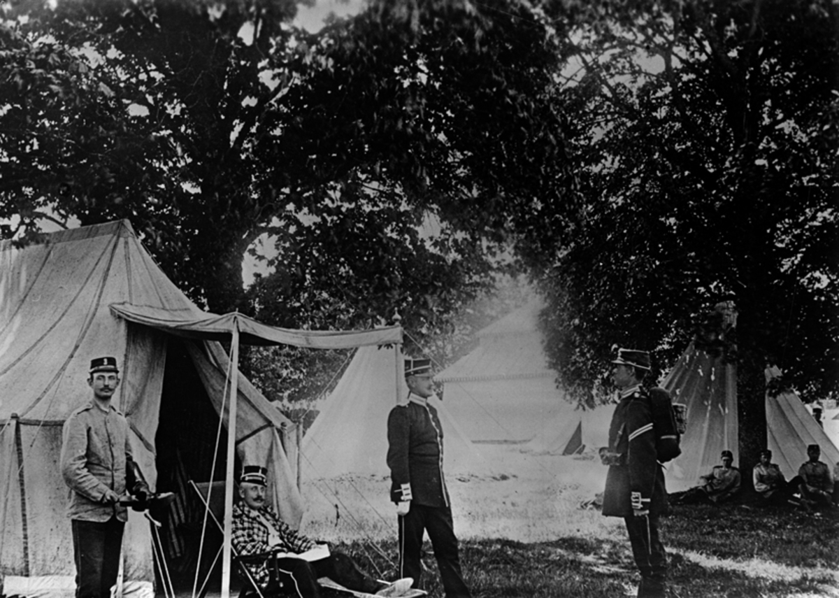 Miljöbild från lägerområde på livgrenadjärregementet på Malmen. Soldater omkring uppställda tält.